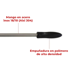 La empuñadura de polietileno garantiza un fácil manejo, fiabilidad y seguridad, ya que es un material muy ligero, además de ser resistente a los agentes químicos, al agua, a los rayos UV y a las altas temperaturas. Además, tiene un notable coeficiente de fricción.