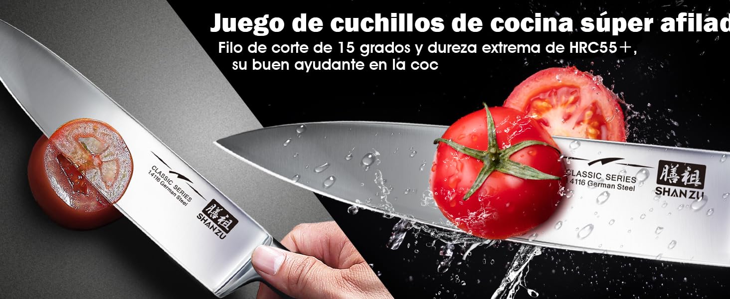 - ▶Hoja Alemán de Acero Inoxidable - La hoja del set cuchillos cocina profesional está fabricada en acero inoxidable alemán especial con una dureza de 55-57 RHC y forjado con precisión para evitar problemas de rotura de la hoja y resistencia a la corrosión. Contiene un 15% de cromo que es un elemento traza, debido a que este cuchillo tiene un alto contenido de cromo, tiene una excelente resistencia a la corrosión y la oxidación.